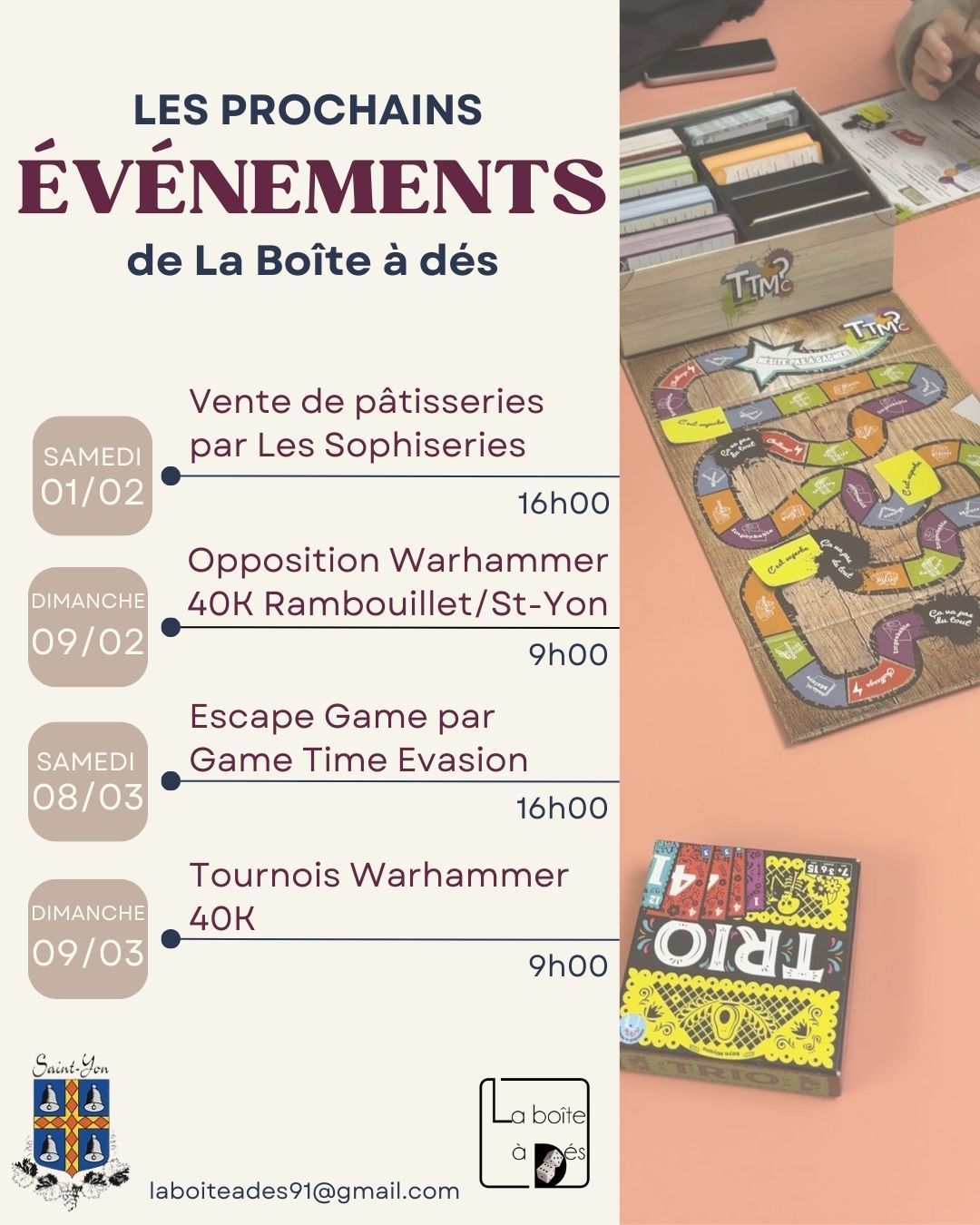 Fondée en juin 2024, et située à Saint-Yon, La Boîte à Dés est une association dédiée aux jeux de société, jeux de cartes et jeux de figurines.